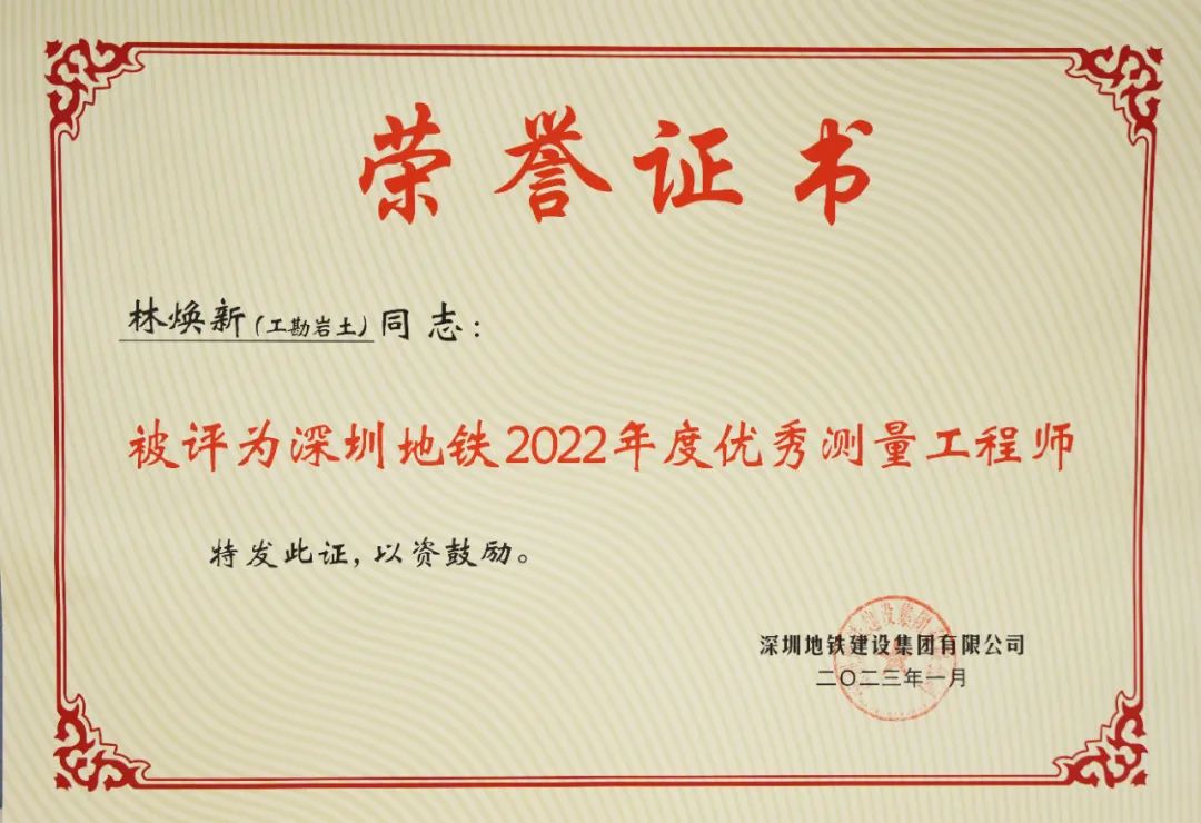 在此次評(píng)比中,測(cè)試中心監(jiān)測(cè)工程師林煥新同時(shí)獲評(píng)為“深圳地鐵2022年度優(yōu)秀測(cè)量工程師”!
